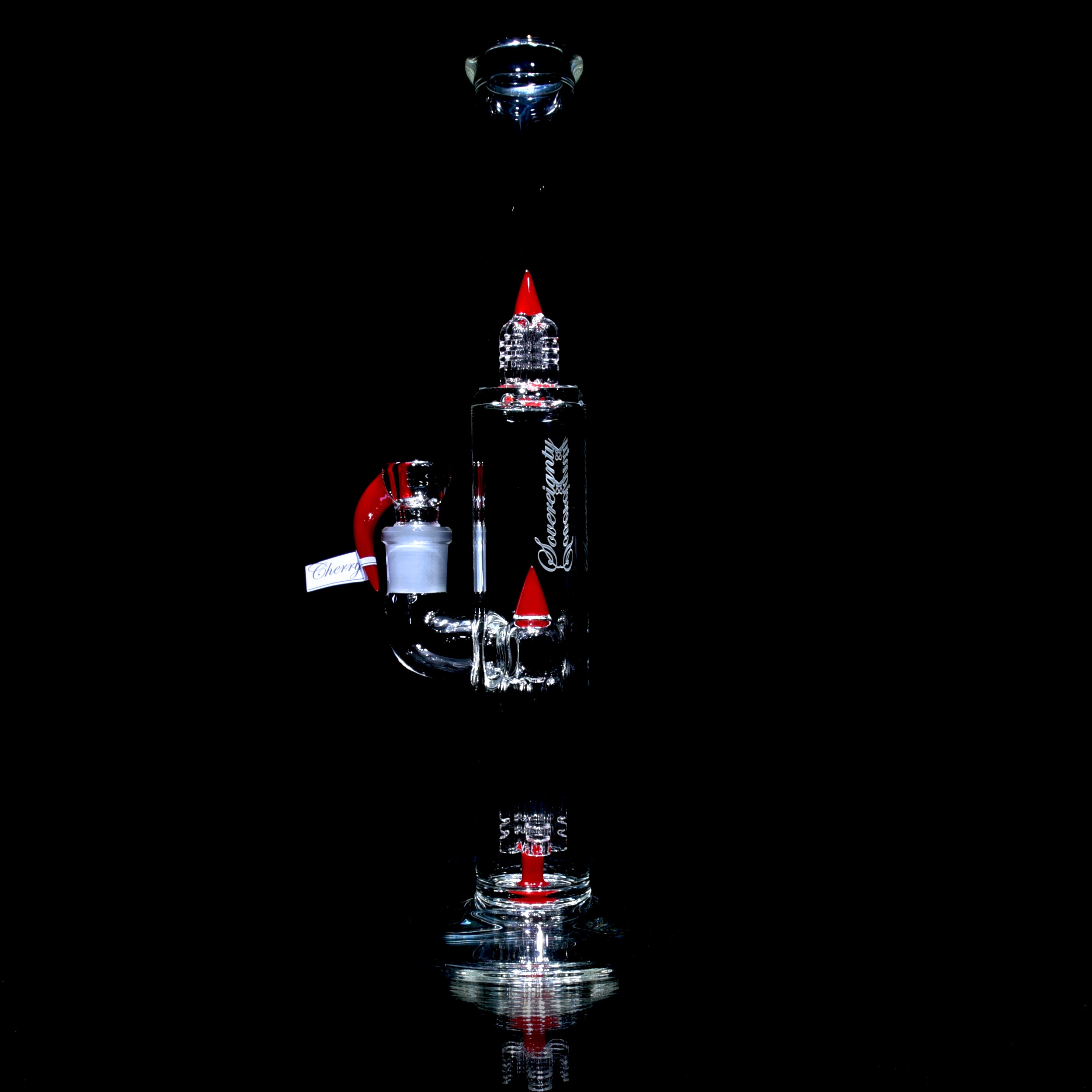 • Highly sought after Sovereignty Glass PA Pawn - Slitted Fixed 4 Perc Tube w/ Inv4 Splashguard with awesome Cherry accents!